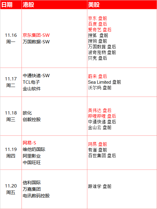 本周港美股市场将迎来多家公司的重磅财报密集发布。其中港股市场关注度最高的有在今年6月赴港二次上市的两大中概科技股京东集团-SW和网易-S。