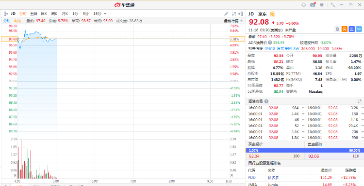 11月16日(周一)美股盘前,京东(JD.US)股价上涨,截至17:10,该股涨5.82%,报97.44美元。