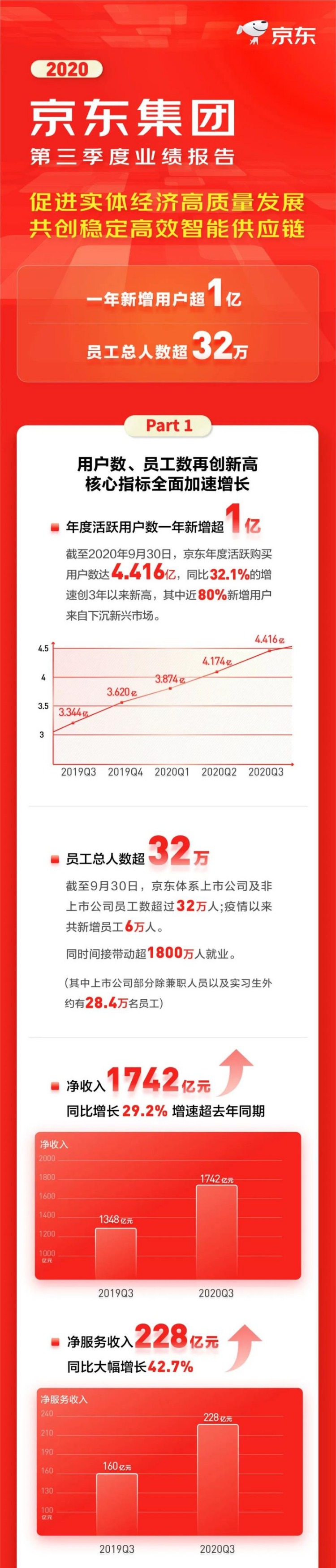 如今,中国正逐步从新冠疫情的影响中走出,我们很高兴地看到,依托于京东在线上和线下的供应链基础设施,我们的商业合作伙伴得以迅速从疫情中恢复。京东的品牌形象也更加深入人心,过去一年中新增超1亿活跃用户。”京东集团董事会主席兼首席执行官刘强东先生表示,“面对新冠疫情带来的各种不确定性,京东本季度积极扩大就业规模,确保持续为用户提供优质的购物体验,同时更好地服务于商业伙伴。我们期待,京东将继续发挥供应链技术的领先优势,不断将数字技术与实体经济深度融合,回馈社会。