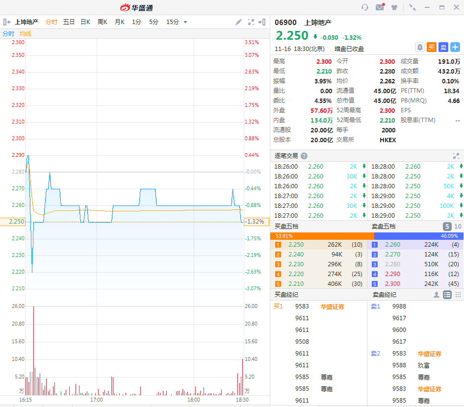 华盛资讯11月16日讯,截至收盘,金科服务(09666.HK)暗盘收盘报价45.50港元,较发行价44.70港元涨幅为1.79%,一手账面盈利80港元。最新成交额8400万港元,总市值为287.9亿港元;上坤地产(06900.HK)暗盘收盘报价2.25港元,较发行价2.28港元跌幅为1.32%,一手账面亏损60港元。最新成交额432万港元,总市值为45亿港元,两股都将于11月17日正式上市。