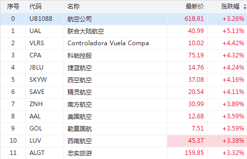 航空股亦普遍上涨,联合大陆航空涨超5%,美国航空公司涨3.59%。