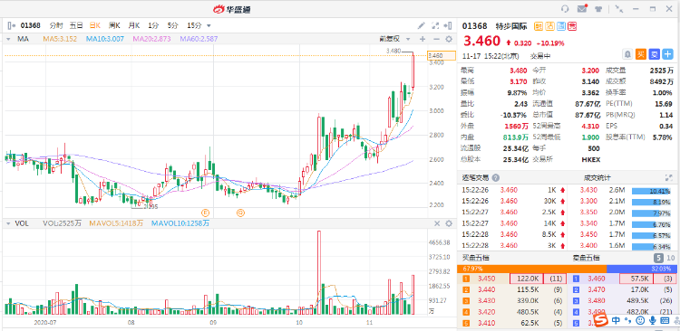 11月17日消息,特步国际涨10.19%,现报3.46港元,创近9个月新高,最新市值87.67亿港元。