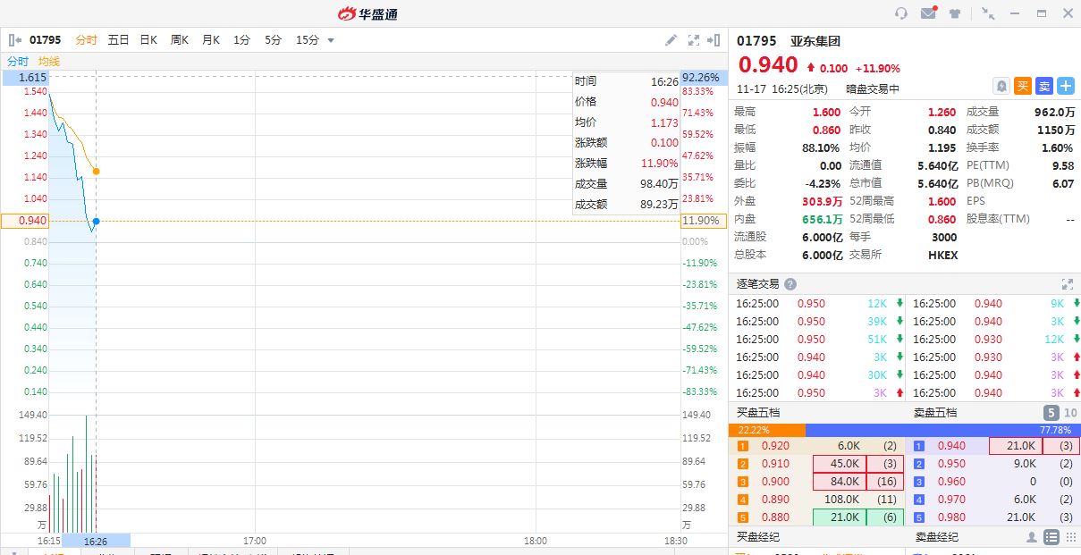 华盛资讯11月17日消息,亚东集团(01795)、祥生控股集团(02599)正在进行暗盘交易,目前亚东集团涨逾10%,不计手续费一手盈利300港元;祥生控股集团暗盘则破发。