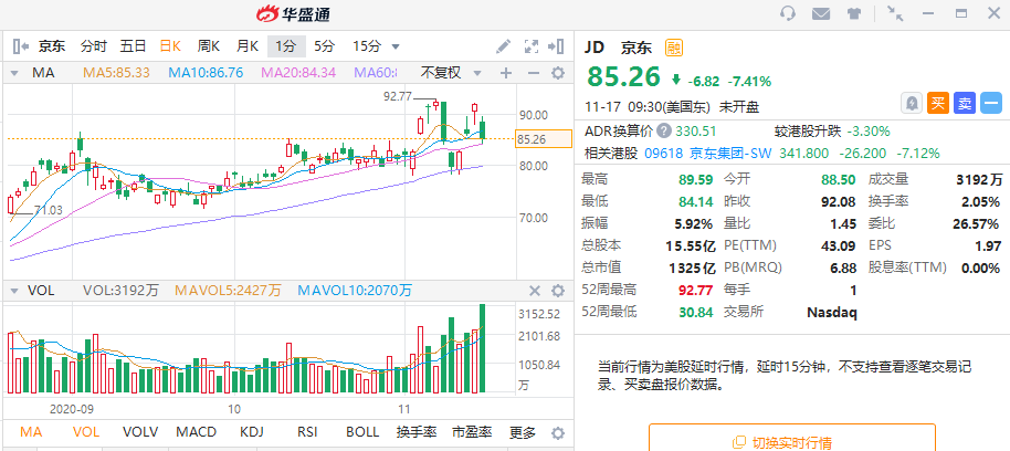首先看京东,京东在11月16日公布业绩后美股下跌7.41%,其后港股也跌幅超7%。事实上京东本次公布的业绩超出预期,不过也需要注意11月6日京东(JD)刚创下历史新高,3月以来累计涨幅已经接近翻2倍,高位有所回调属于正常现象。