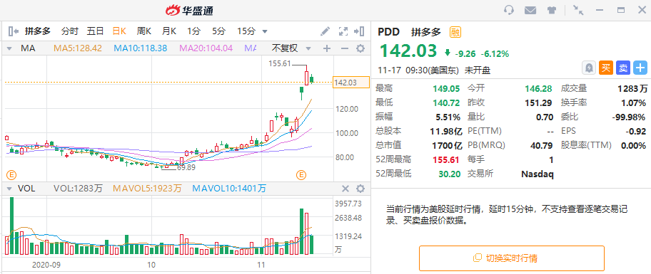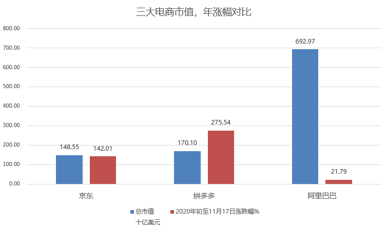 而截至11月17日凌晨美股收市,2020年初以来拼多多累计涨幅高达275.54%,京东集团以142%累计涨幅排名第二,阿里巴巴则以21.79%累计涨幅排名第三。