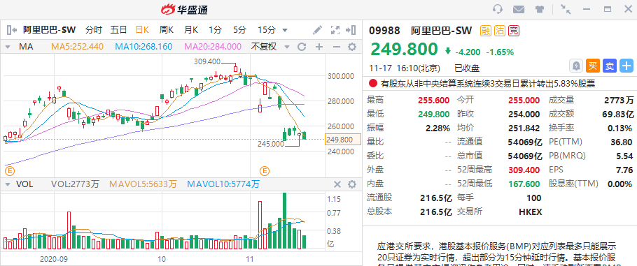 而阿里巴巴-SW自10月28日以来,已经从309.4港元跌至249.8港元,回调幅度接近20%。