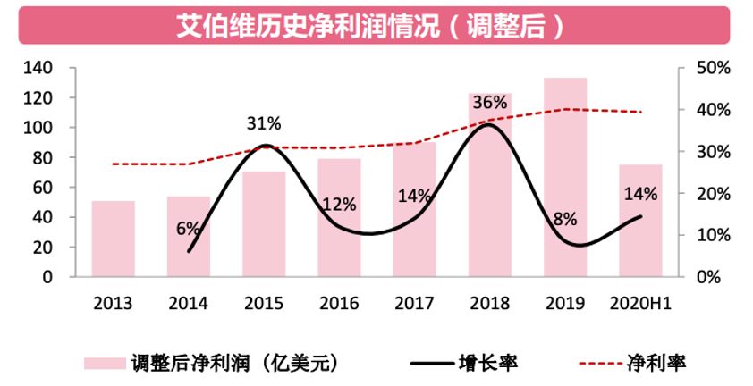 2014-2019年,艾伯维公司调整后净利润年复合增长率高达19.9%,2020年上半年净利润增速为14%。期间,艾伯维公司的净利润率水平维持在30%-40%之间,盈利能力强劲。