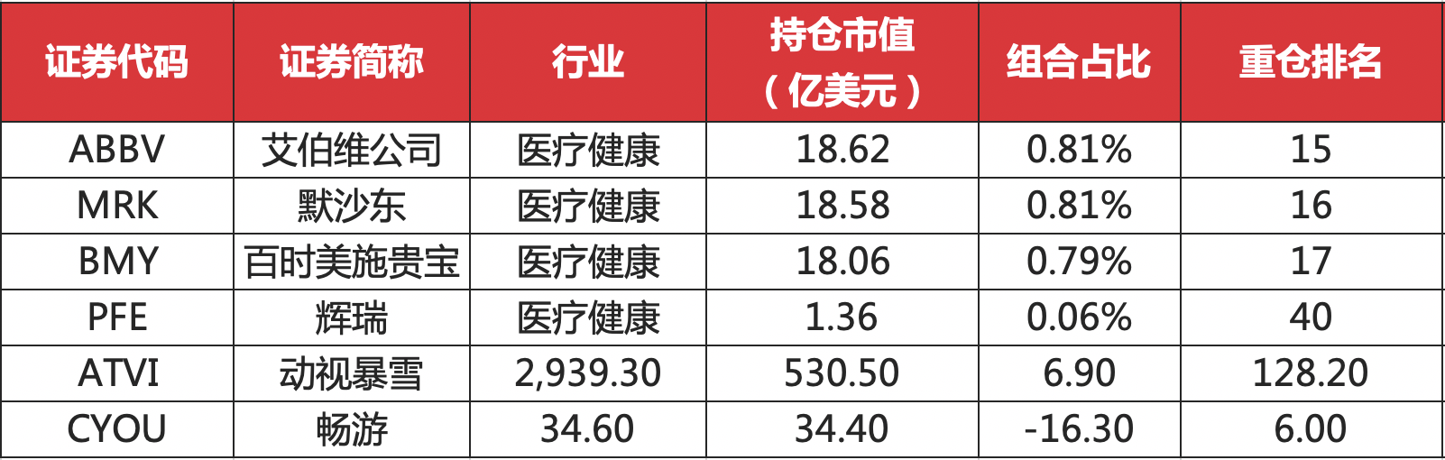 其中较为重仓的是艾伯维公司、默沙东和百时美施贵宝,持仓总市值在18-19亿美元间,占总持仓比重约0.8%,分列15、16、17位重仓股。除上述3只股票外,巴菲特还买入了1.36亿美元的辉瑞,占其总持仓比例仅0.06%,位列仓位排名第40位。