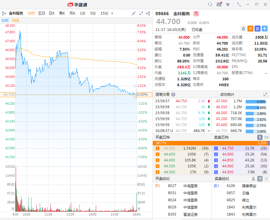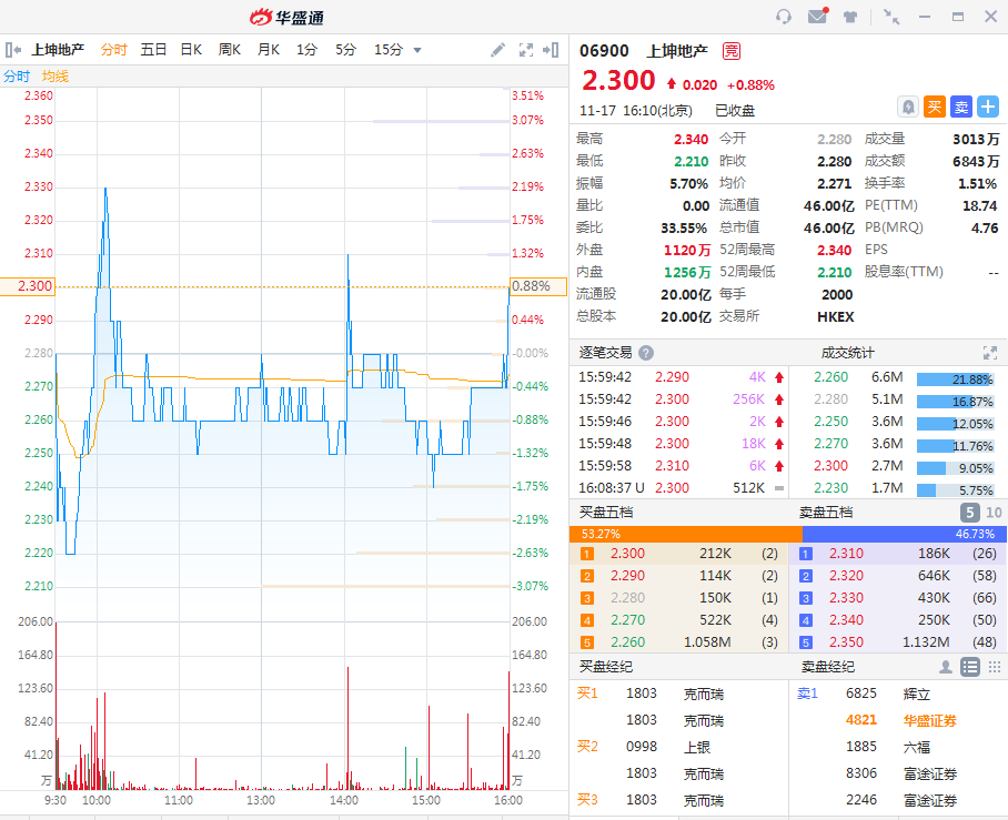 华盛资讯11月17日讯,两股今日首挂。截至收盘,金科服务(09666.HK)平收,开盘价44.7港元,全日最高价48.0港元,最新总市值282.9亿港元,成交额11.58亿港元;上坤地产(06900.HK)收涨0.88%,报价2.3港元,最新总市值46亿港元,成交额6843万港元,一手盈利40港元。