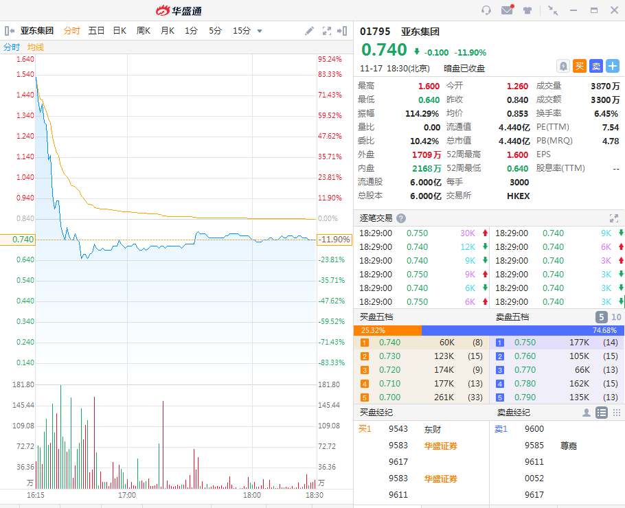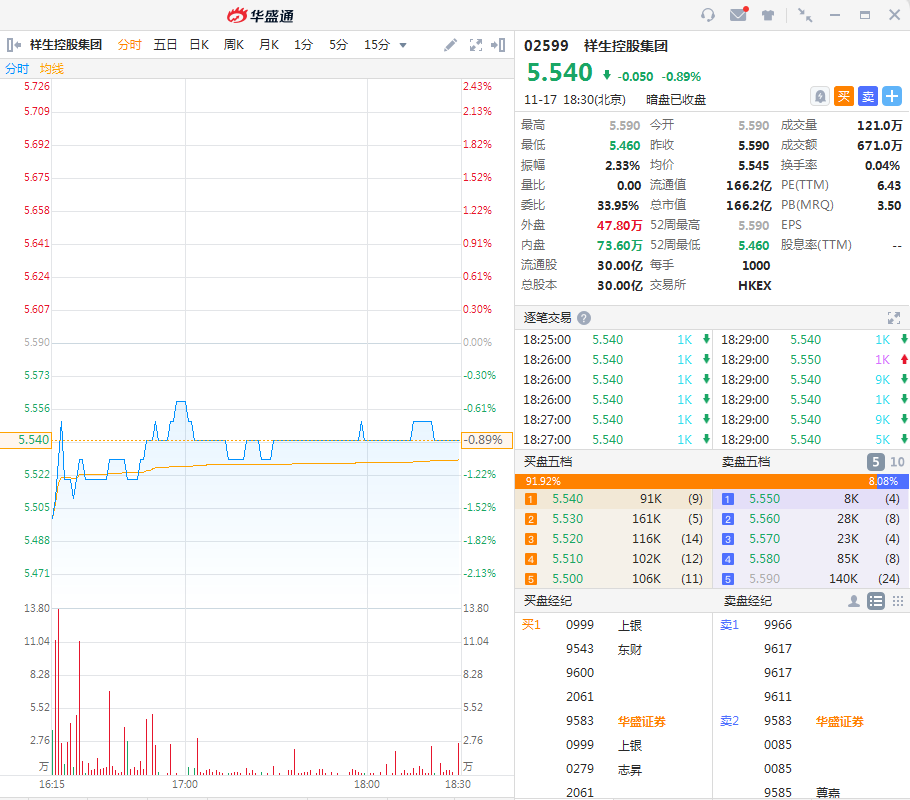 华盛资讯11月17日讯,截至收盘,亚东集团(01795.HK)暗盘收盘报价0.74港元,跌幅为11.9%,一手账面亏损300港元。最新成交额3300万港元,总市值为4.44亿港元;祥生控股集团(02599.HK)暗盘收盘报价5.54港元,微跌0.89%,一手账面亏损50港元。最新成交额671万港元,总市值为166.2亿港元,两股都将于明天正式上市。