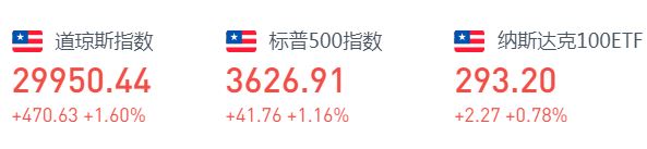 截至收盘,标普500指数涨1.16%,报3626.91点;纳斯达克指数涨0.80%,报11924.13点;道琼斯指数涨470.60点,涨幅1.60%,报29950.44点。