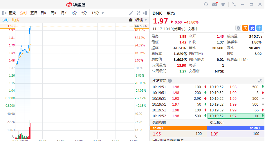 华盛资讯11月17日消息,今日美股盘初,蛋壳公寓行情异动,截至发稿,股价迅速拉升涨近44%。