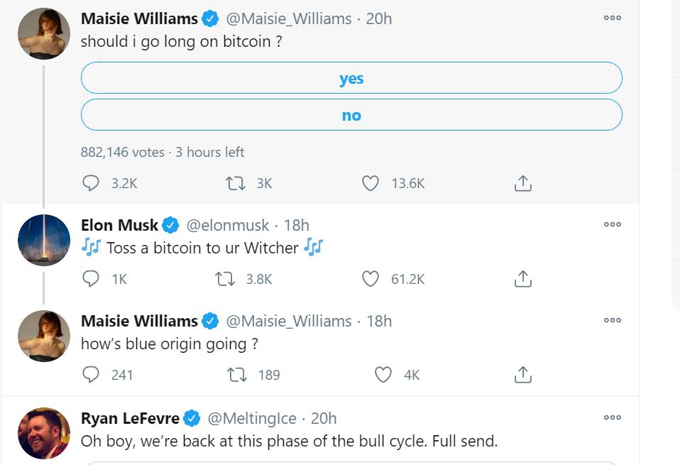 虽然一些死忠密码迷在它的起起伏伏中坚持了下来,但也有一些人在疫情的时候开始为它着迷。本周,在HBO电视剧《权力的游戏》(Game of Thrones)中扮演艾莉亚·史塔克(Arya Stark)的女演员麦茜·威廉姆斯(Maisie Williams)在推特上问她的270万粉丝是否应该投资比特币,这让比特币的人气大增。该调查得到了知名密码技术投资者诺佛格拉茨(Mike Novogratz)和特斯拉(Tesla Inc.)首席执行官马斯克(Elon Musk)的回答。