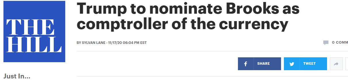 (《国会山报》:特朗普将提名布鲁克斯担任美货币监理局负责人)