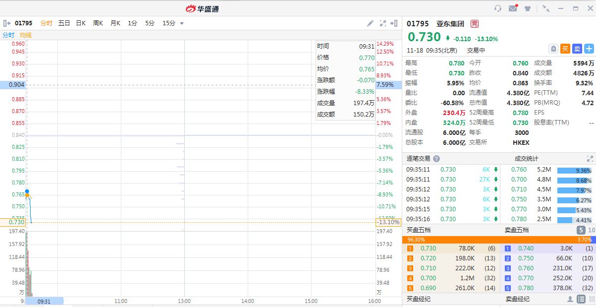 亚东集团昨日暗盘收盘报价0.74港元,跌幅为11.9%,一手账面亏损300港元;祥生控股集团昨日暗盘收盘报价5.54港元,微跌0.89%,一手账面亏损50港元。
