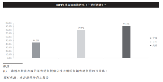而在洗衣液领域国内对比其他国家来看,截至2019年,美国市场洗衣液渗透率高达91.4%,日本市场洗衣液渗透率也达到79.5%,国内市场洗衣液渗透率仅为44.0%,存在巨量的增长空间。
