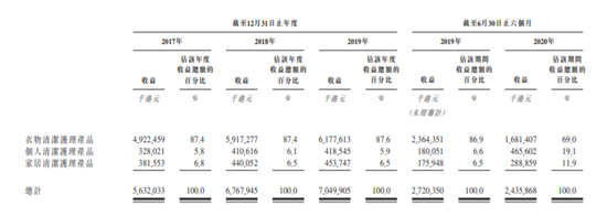 具体来看,蓝月亮的营收主要由三部分组成,据更新后的招股书显示,截至2020年6月30日止六个月,其中衣物清洁产品占比最高保持在69%左右,而家居清洁护理产品与个人清洁护理产品占比则分别为11.9%和19.1%左右。
