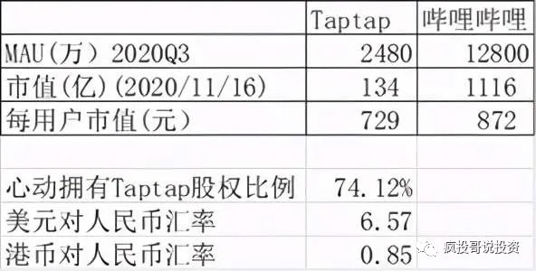 1. Taptap的用户价值显然要高于哔哩哔哩用户的价值,游戏玩家的付费意愿要比一般视频吃瓜群众的付费意愿强,这个没什么可争议的吧?当然,B站的用户基数大,广告价值要大些。综合考虑,保守的拍脑袋估计,我个人认为,Taptap的每用户市值应该至少应高于B站每用户市值的50%。
