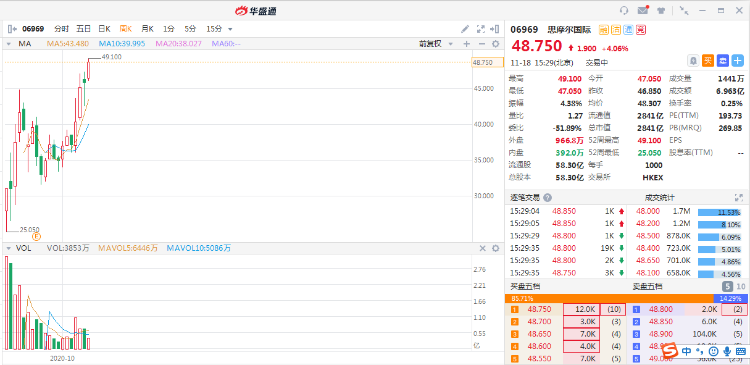 思摩尔国际(6969.HK)股价再度走强,盘中最高见49.1港元再创历史新高,现报48.75港元,涨幅4.06%,最新总市值2841亿港元;月内累计涨幅逾20%。
