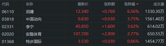 体育用品股普遍走强,滔搏涨6.5%领涨,高见12.38港元创历史新高;李宁、中国动向均涨超3%,安踏涨超2%。