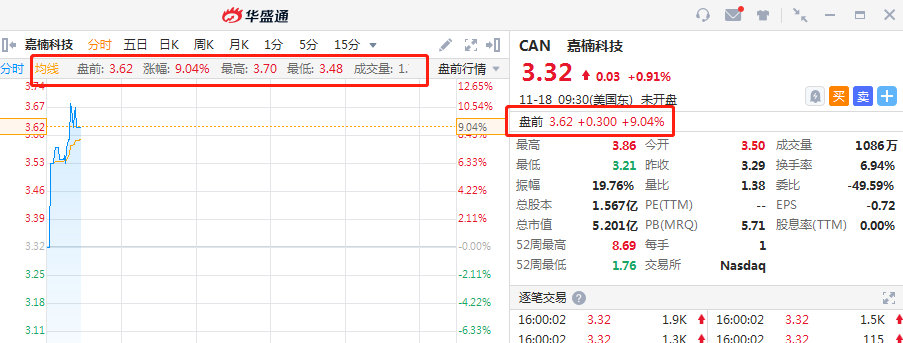 华盛资讯11月18日消息,今日美股盘前,区块链概念股再次走强,截至发稿,Riot Blockchain(RIOT)盘前涨超18%,Marathon Patent(MARA)盘前涨超16%,嘉楠科技(CAN)盘前一度涨超10%。