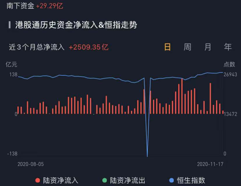 南下资金今日净流入港股29.29亿港元,较昨日流入规模增加约20亿港元。