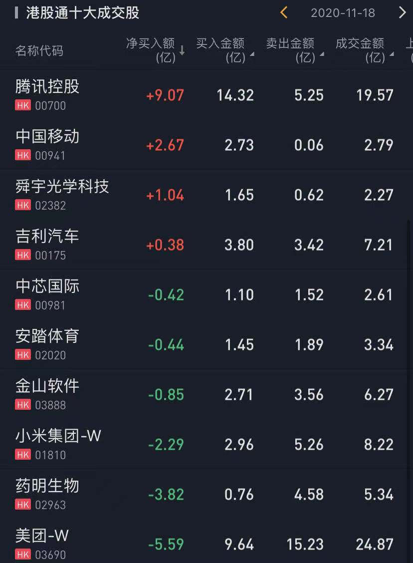 个股方面,今日南下资金净买入腾讯控股9.07亿港元,为今日买入之最。此外,南下资金净买入中国移动2.67亿港元,净买入舜宇光学科技1.04亿港元。此外,南下资金净卖出美团-W5.59亿港元,为今日抛售之最。