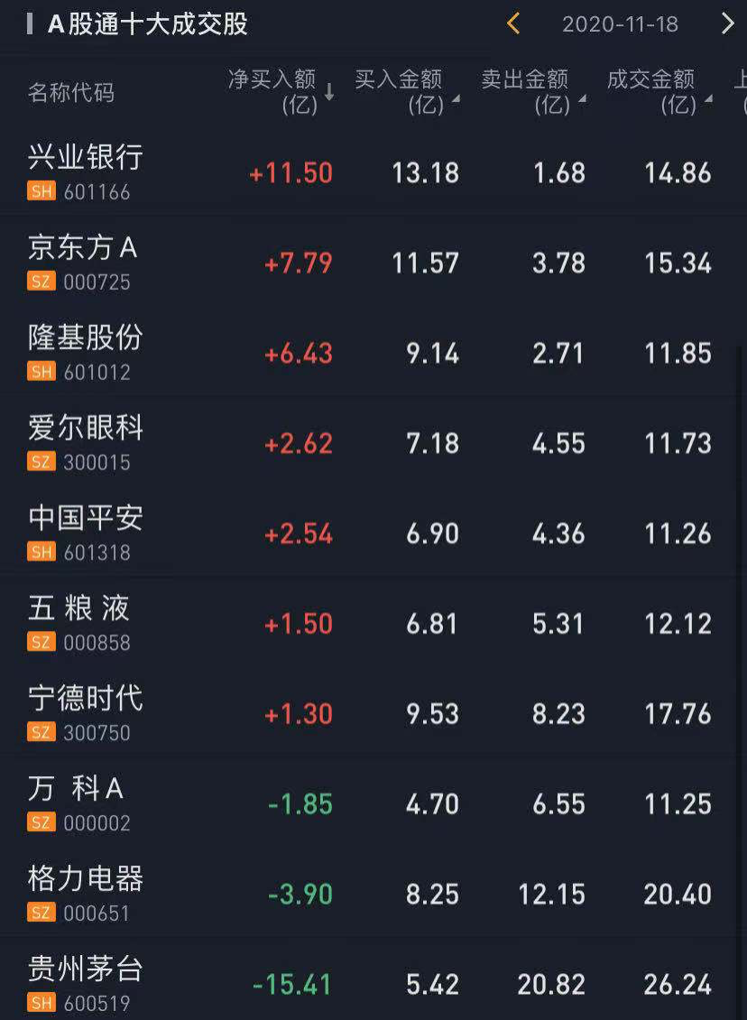北上资金今日净买入兴业银行11.50亿元,净买入京东方A7.79亿元,净买入隆基股份6.43亿元。此外,北上资金净卖出贵州茅台15.41亿元,为今日抛售之最。