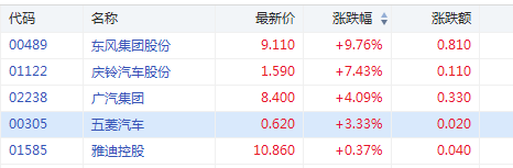 汽车股集体走强。截至发稿,东风集团股份(00489)涨9.76%,报9.11港元;庆铃汽车股份(01122)涨7.43%,报1.59港元;五菱汽车(00305)涨3.33%,报0.62港元;广汽集团(02238)涨4.09%,报4.21港元。
