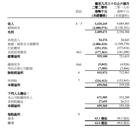 11月19日消息,维他奶集团公告,截至2020年9月30日止6个月,集团实现收入44.10亿港元,同比下降6%;毛利24.10亿港元,同比下降6%;公司股权持有人应占溢利6.72亿港元,同比增长26%;每股基本盈利63.1港仙,宣派中期股息每股3.8港仙。
