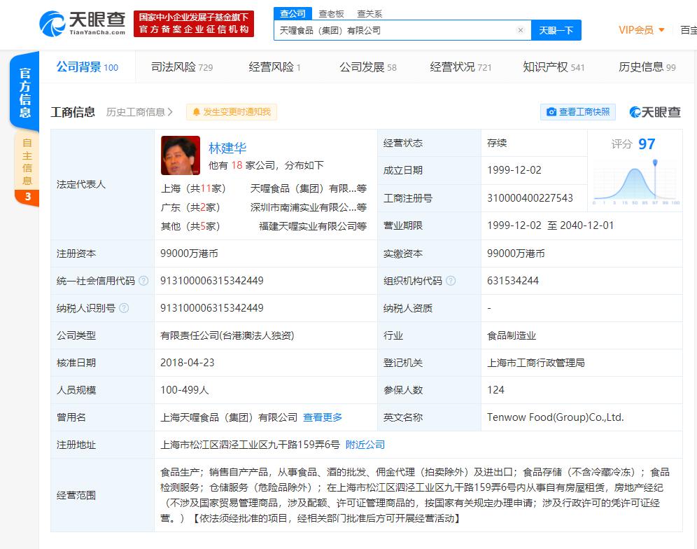天眼查App显示,天喔食品的大陆关联公司为天喔食品(集团)有限公司,该公司成立于1999年12月,法定代表人为林建华,注册资本9.9亿港币,经营范围含销售自产产品,从事食品、酒的批发、佣金代理(拍卖除外)及进出口;食品存储(不含冷藏冷冻);食品检测服务等。该公司由香港南浦国际有限公司全资控股。