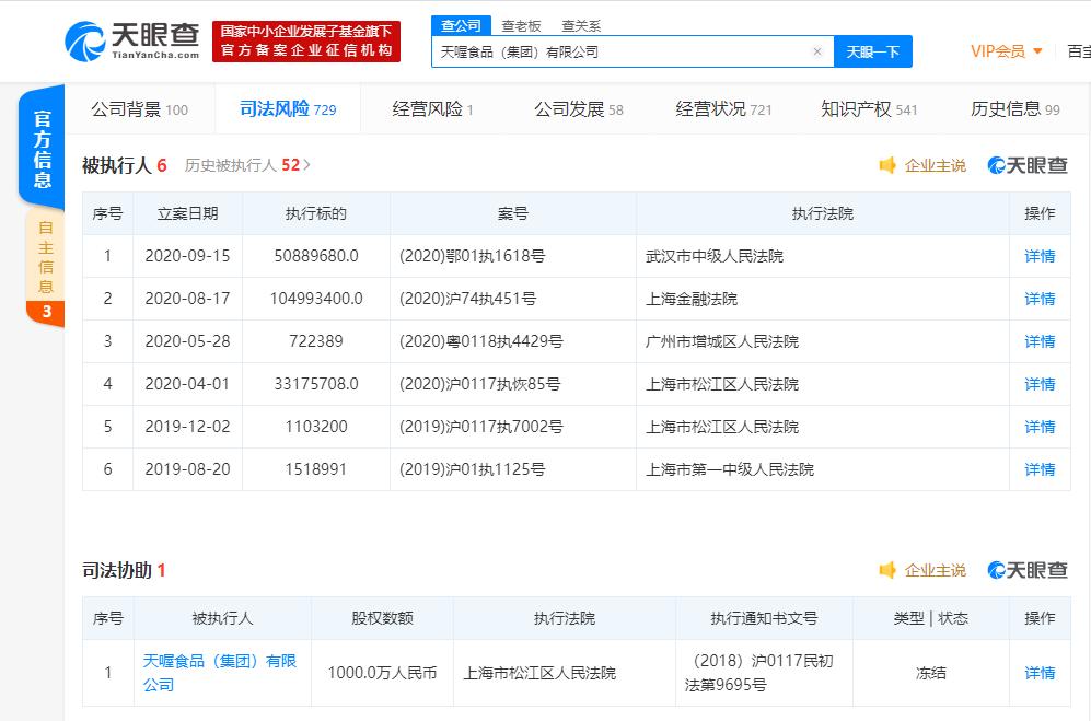 天眼查App显示,2018年6月,天喔食品(集团)有限公司有一笔股权冻结记录,执行法院为上海市松江区人民,执行事项为公示冻结股权、其他投资权益,其中被执行人持有股权、其它投资权益的数额为1000万人民币。冻结期限为3年,冻结期限至2021-06-12。