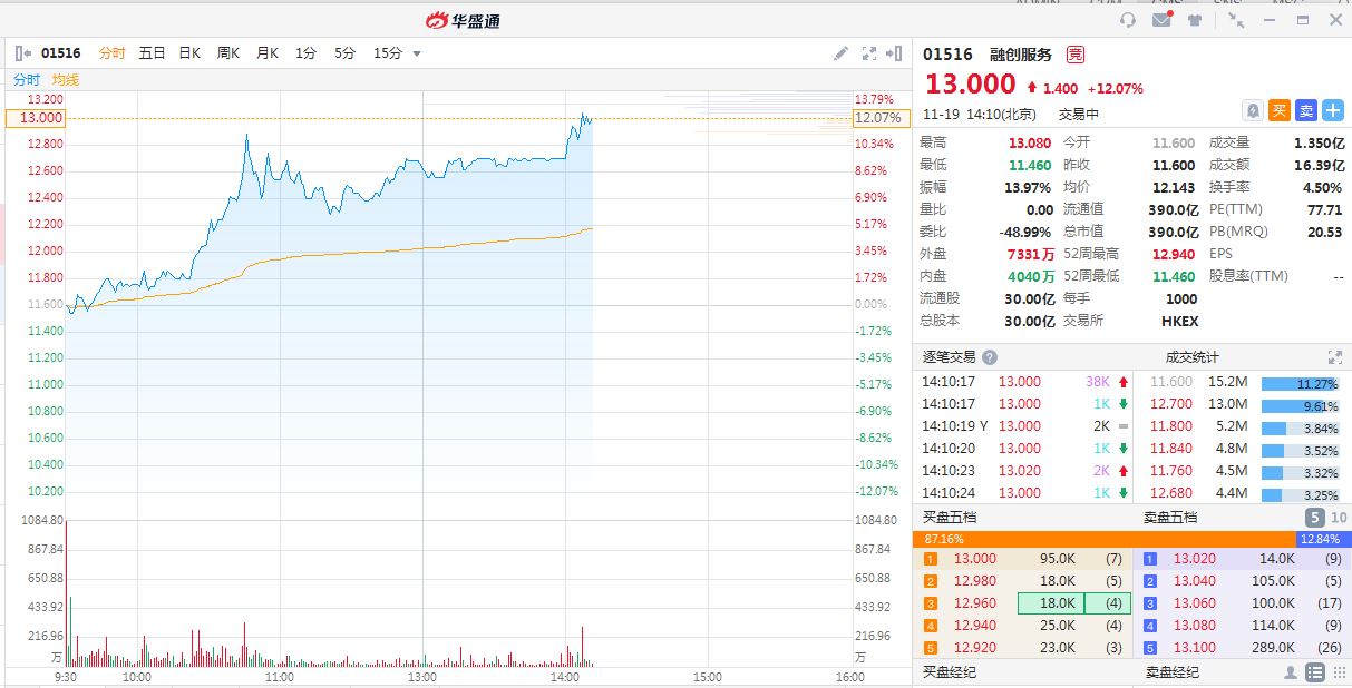 融创服务 (01516.HK) 今日首挂,股价平开后,不断走高,午后涨幅超12%,不计手续费,一手盈利1400港元。