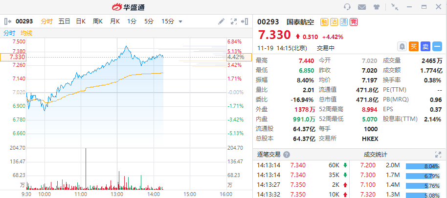国泰航空(00293)午后继续走强,最高见7.44港元创六月以来新高,现报7.33港元,涨幅4.7%,最新总市值471.8亿港元,3个月累计涨幅35%。