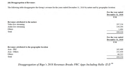 2018年6月宣布Bigo D轮融资和2019年3月完成收购Bigo的新闻稿聚焦于Bigo Live和Likee,将Bigo描绘成一个价值14.5亿美元的全球直播公司。这些声明强调了Bigo Live的直播平台将中国排除在外,但并没有提及Bigo收入的很大一部分来自中国的音频直播应用。