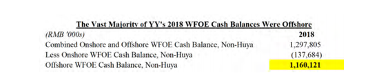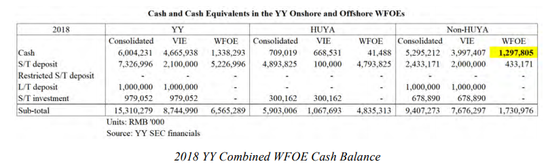下表显示了不包含虎牙的情况下,YY在岸和离岸外商独资企业账面现金余额合计12.98亿元。