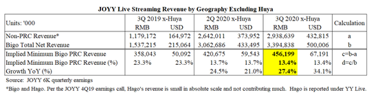 我们发现,根据提交的文件,Bigo在中国的潜在收入一直在为Bigo带来增长。2019年,YY开始在季度财报中披露其中国和非中国直播收入的分成情况。YY的非中国收入主要来自Bigo,少量来自Huya和Hago。假设Bigo及其合并子公司占YY非中国收入的100%,我们可以通过从Bigo总收入中减去YY的所有非中国收入来计算Bigo的最低在岸中国收入。