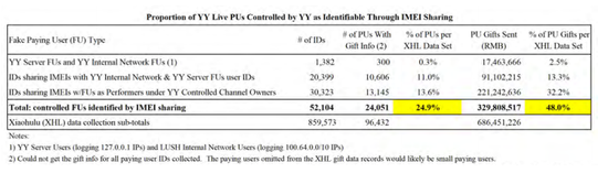 通过交叉引用我们的数据分析和XHL数据库中的付费用户信息,可以来识别这些YY控制的付费用户群。我们给YY控制的付费用户所下的定义为:(a)发送礼物时显示YY本地服务器或内部网络IP的付费用户;(b)与YY控制频道所有者下的付费用户直接或间接链接的移动设备ID(IMEI)。
