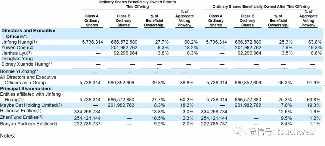 IPO后,Jinfeng Huang(黄锦峰)持股为25.3%,有63.8%的投票权;Yuwen Chen持股为7.6%,有19.3%的投票权;