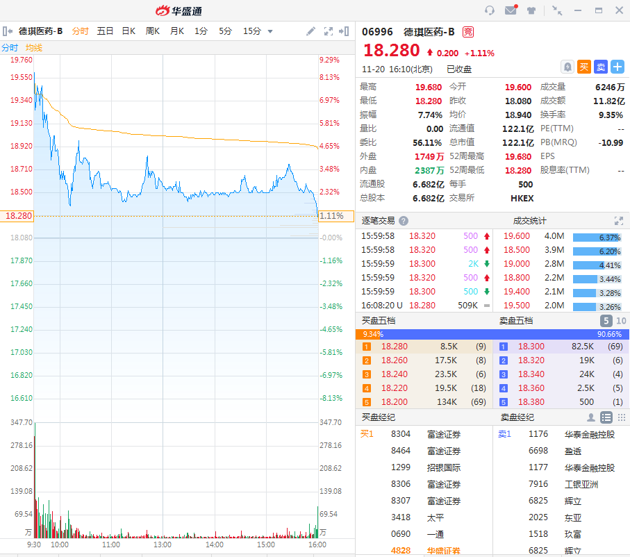华盛资讯11月20日讯,德琪医药-B(06996.HK)收涨1.11%,报价18.28港元。全日最高价19.68港元,最低价18.28港元,最新总市值122.1亿港元,成交额11.82亿港元,一手盈利100港元。