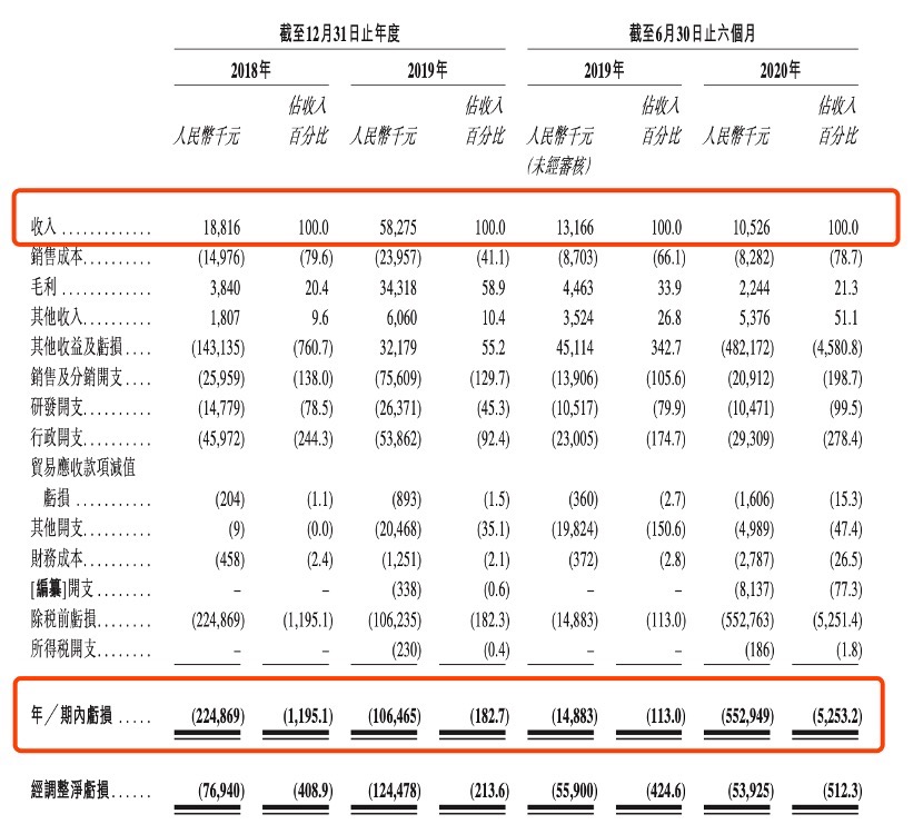 根据招股书,2018、2019年公司分布录得营业收入1881万元、5827万元,期间对应的营收增速高达209%;然而,2020年上半年公司营收仅为1052万元,同比下滑约20%。