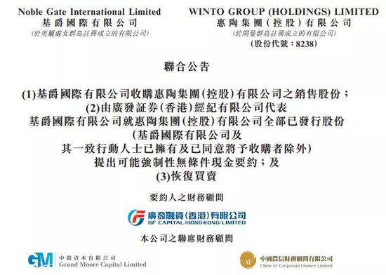 惠陶集团发布公告,广发经纪香港代表基爵国际提出强制性无条件要约及回应文件。