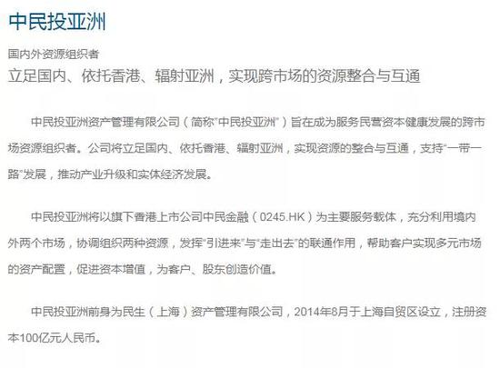 爆料人还提到,中民金融为中民投亚洲资产管理有限公司(简称:中民投亚洲)旗下子公司。
