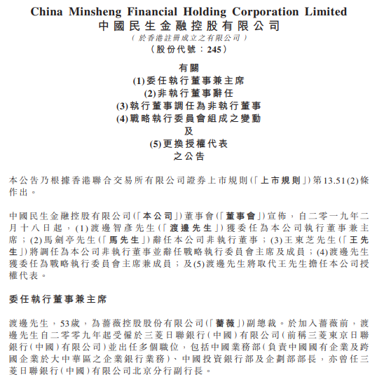 中民金融发布人事变动公告,蔷薇控股副总裁渡边智彦被委任为执行董事兼主席。