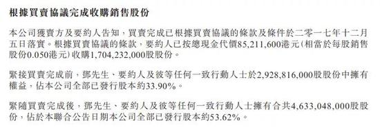 惠陶集团发布的收购公告显示,2017年12月5日,邓先生(邓有声)、基爵国际及其一致行动人(以下简称“一致行动人”)持股比例合计从33.90%升至53.62%。