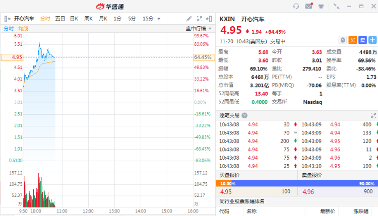 11月20日(周五)美股盘初,开心汽车跳空高开高走,截至北京时间23:43,该股涨超64%,股价在4.9美元附近震荡,成交量超过4498万。
