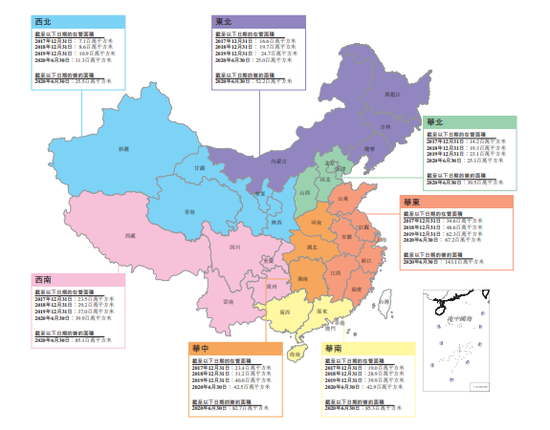 截至2020年6月30日,恒大物业已订约为1,354个项目提供物业管理服务、非业主增值服务及╱或社区增值服务,覆盖22个省、五个自治区、四个直辖市及香港逾280个城市,总在管面积约为254.0百万平方米而签约面积为513.3百万平方米,服务近二百万个家庭。