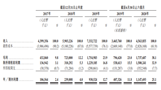 于2017年、2018年及2019年以及截至2020年6月30日止六个月,公司的收入分别为人民币(下同)43.994亿元、59.032亿元、73.327亿元及45.639亿元;公司净利润分别为1.066亿元、2.39亿元、9.305亿元及11.477亿元。