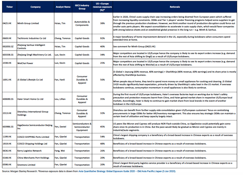 摩根士丹利在11月19日发布的最新报告中认为,随着欧美可能出现大规模的长期封锁,有14只A股和港股将受益于此。
