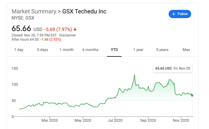 本周五,跟谁学发布2020年第三季度财报,显示收入同比增长252.9%,但净亏损为9.325亿元。股价开盘一度暴跌24%,收盘前跌幅收窄至7.97%。但自今年5月18日浑水公布做空报告以来,跟谁学股价涨了一倍。